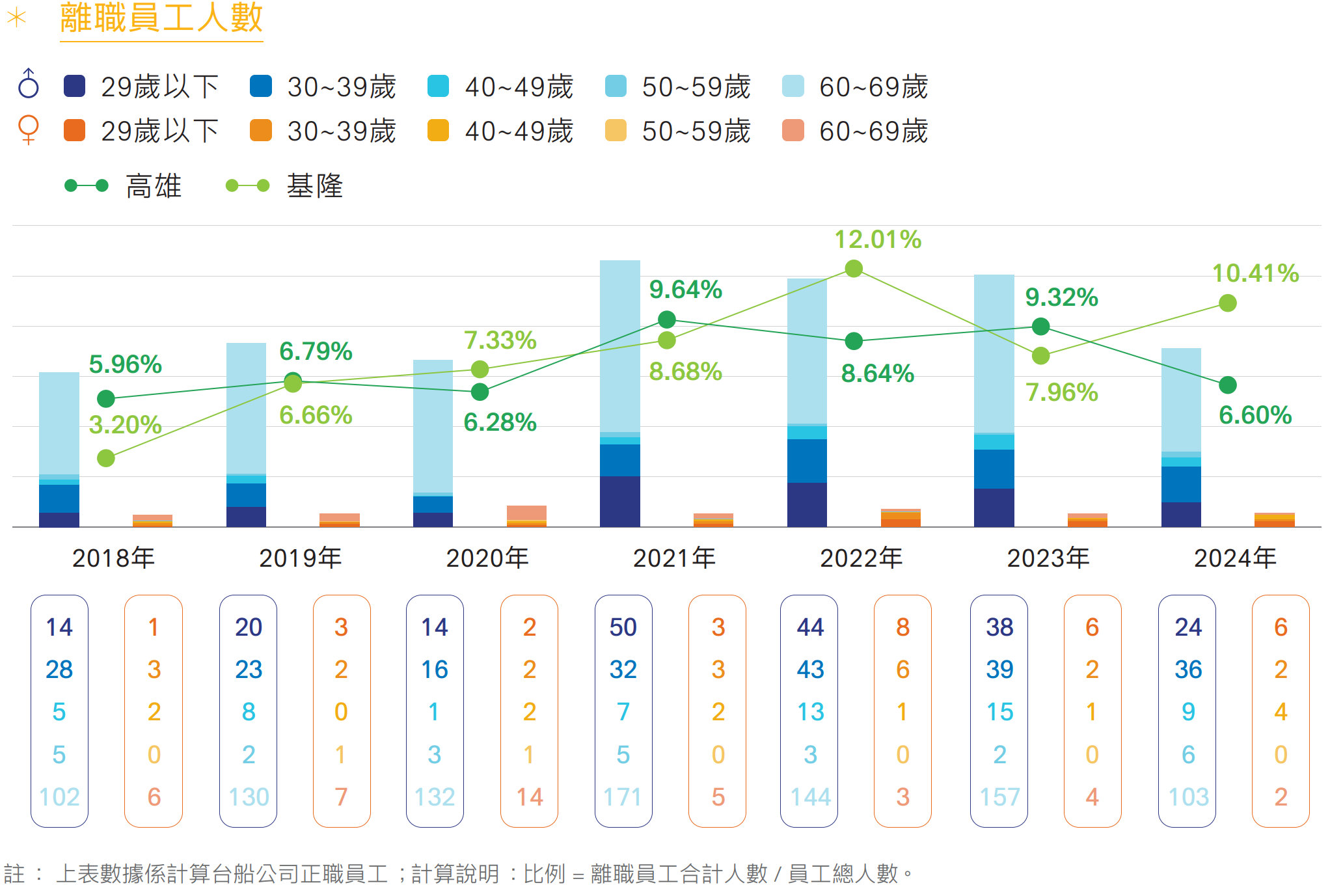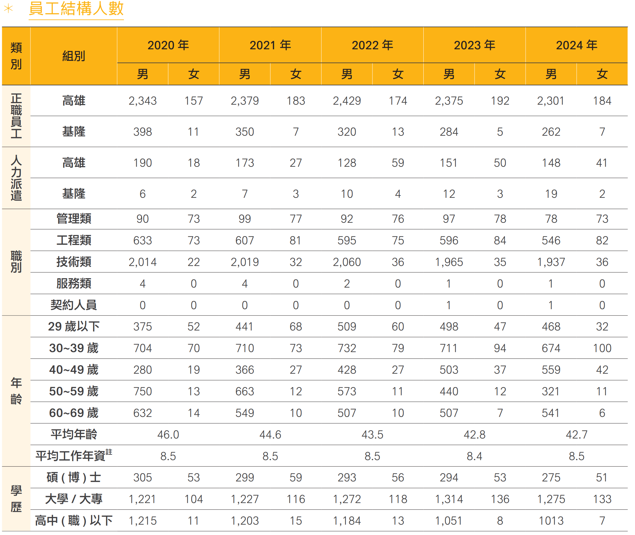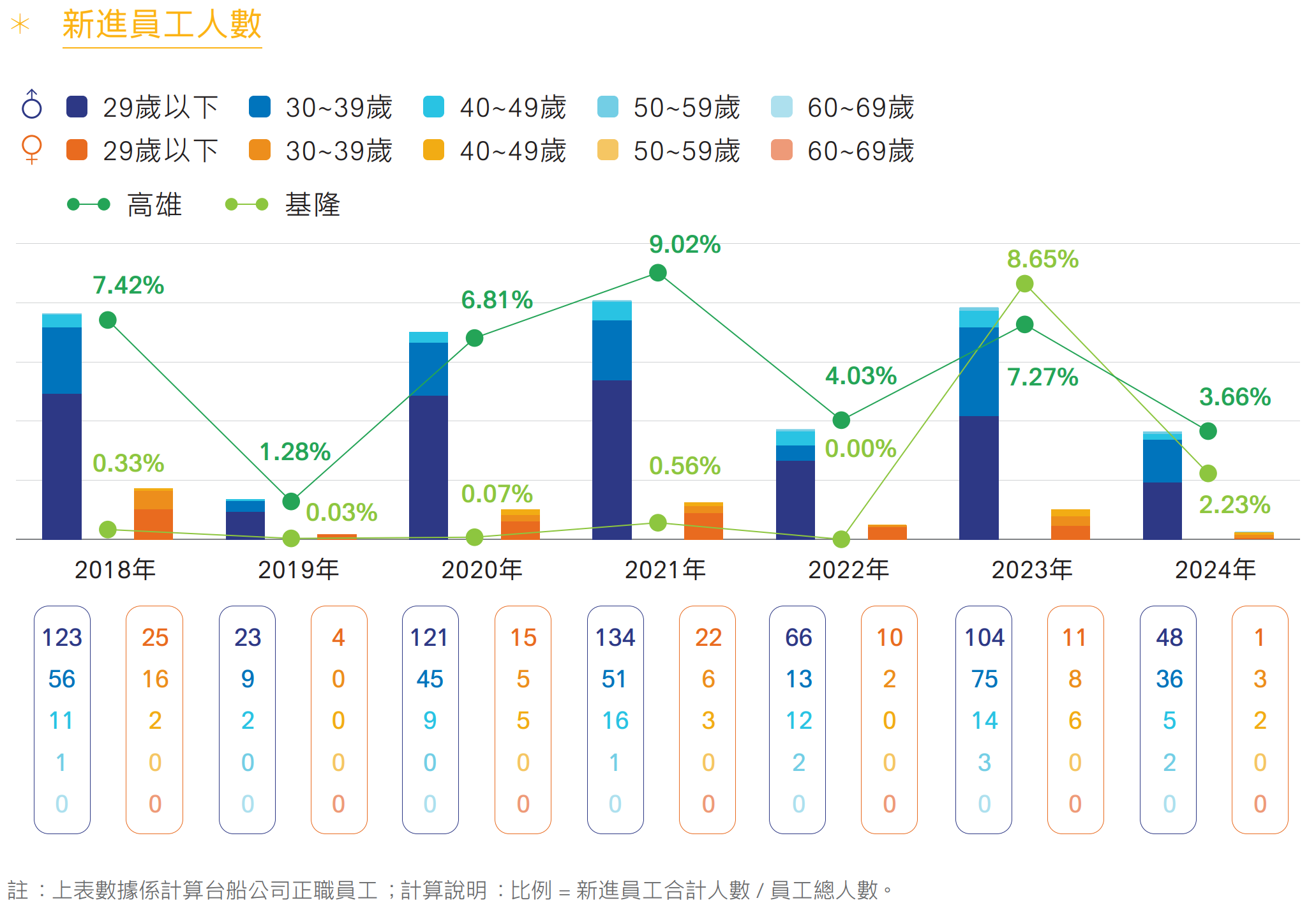台船公司依人才招募之程序法規要求,採取公平、公正、公開之模式徵選合適人才,並有多元進用管道包含公開招考、獎學金甄選、研發替代役等,對於僱用、薪資、績效考評與晉升機會皆不因性別或結婚生育而給予不同等之對待,對於身心障礙人士照顧也持續不斷,為充分保障員工權益,均遵循勞動相關法令訂定、修改各項工作規則及人事管理規定,明確員工權利、義務及福利,並與企業工會訂定團體協約及定期召開勞資會議。此外,為持續拓展多元人才,截至2024年底,台船公司員工總人數為2,754人;其中,由於台船公司屬於製造業,多以現場製造單位為主,故男性員工比例較高,性別比例約13.4:1。