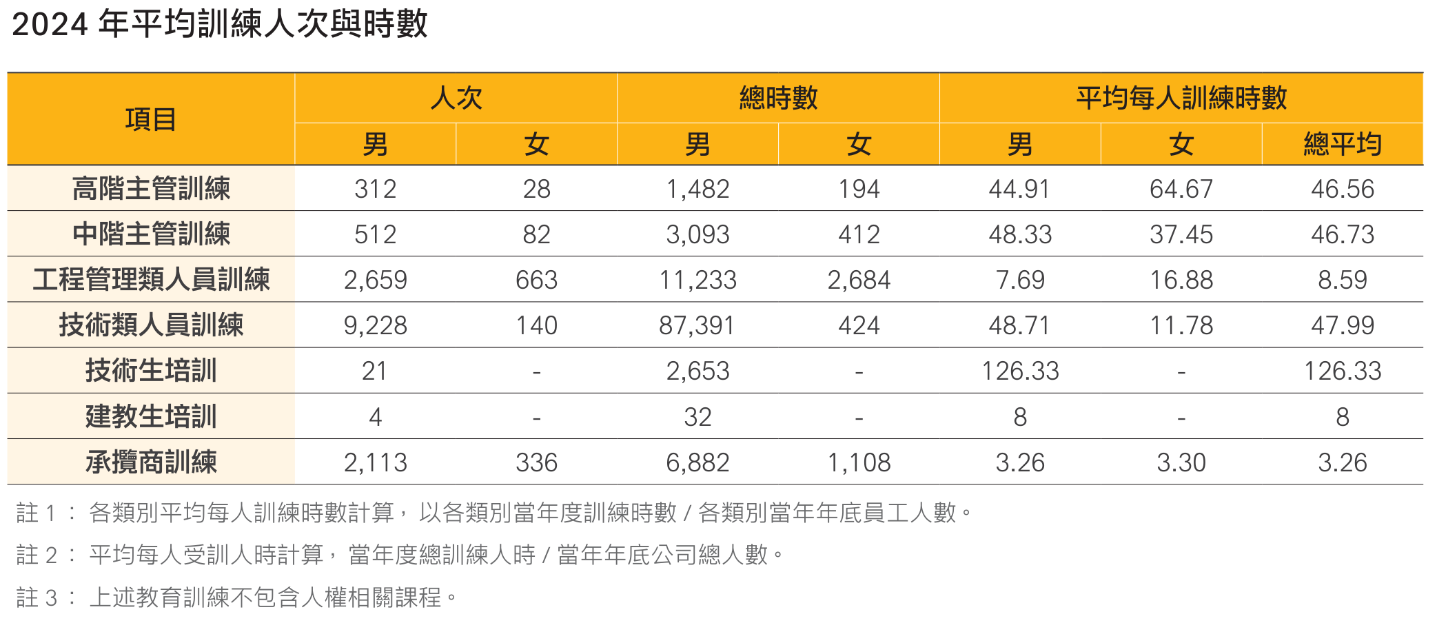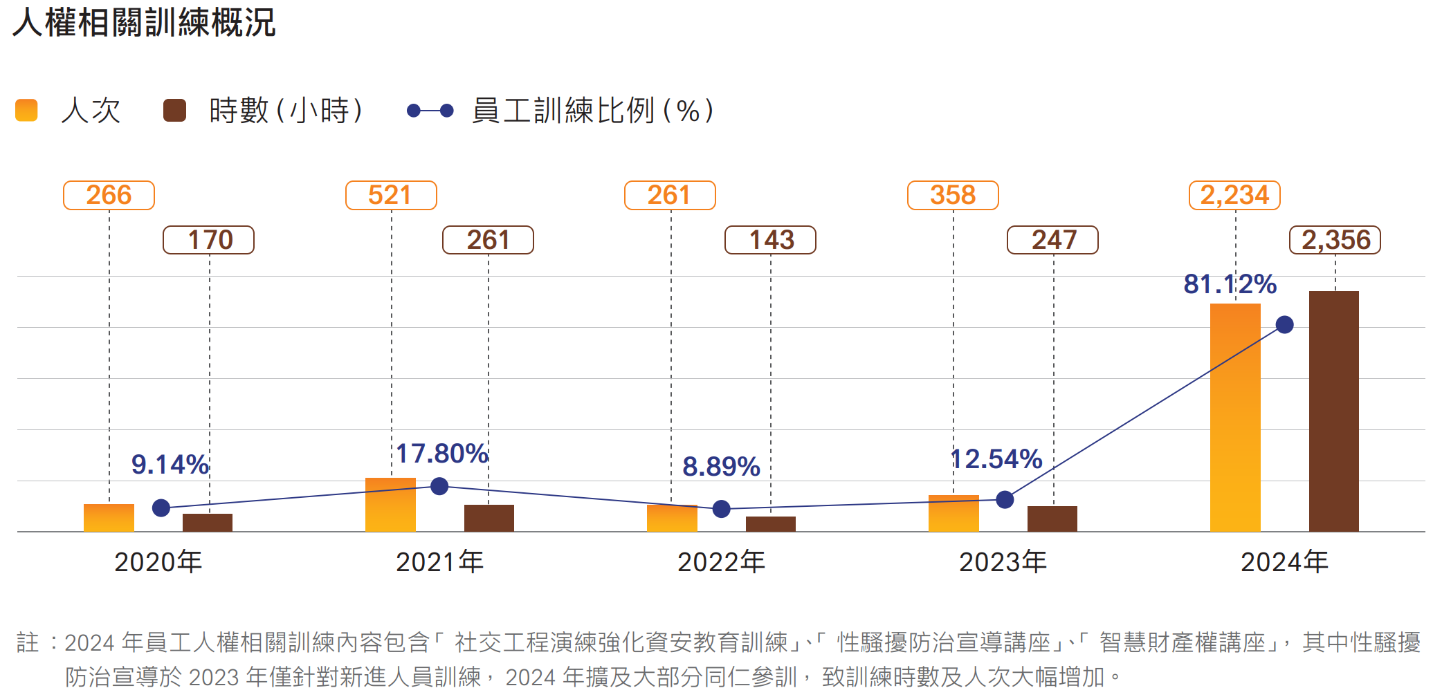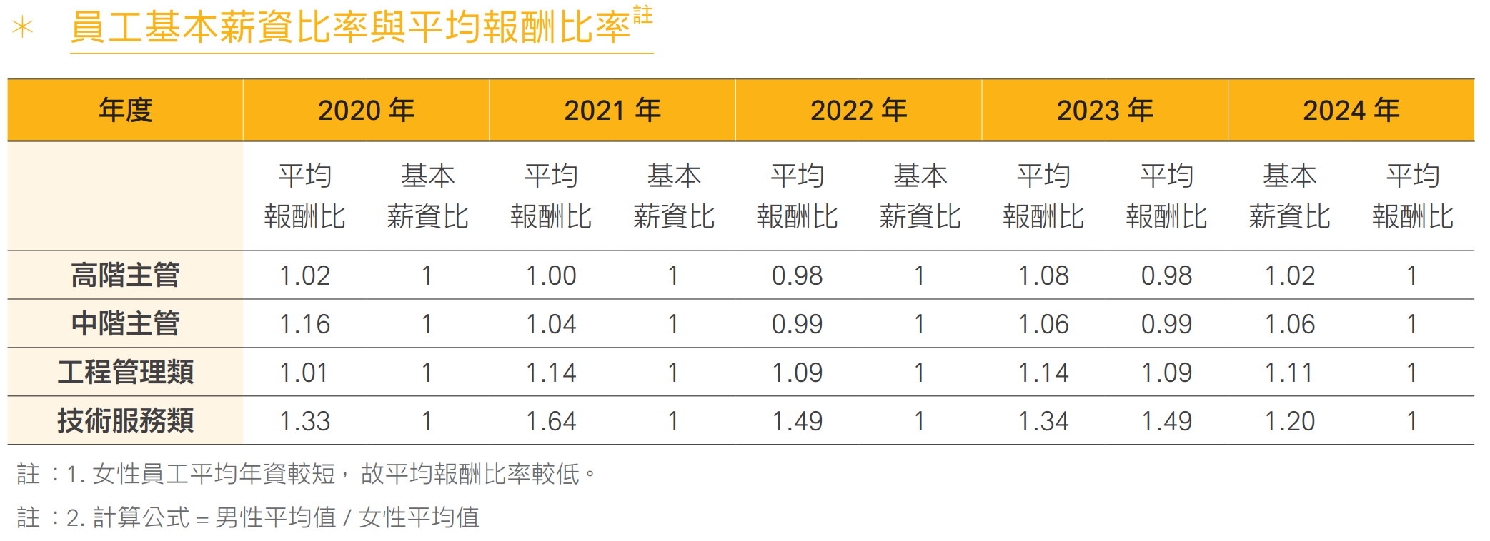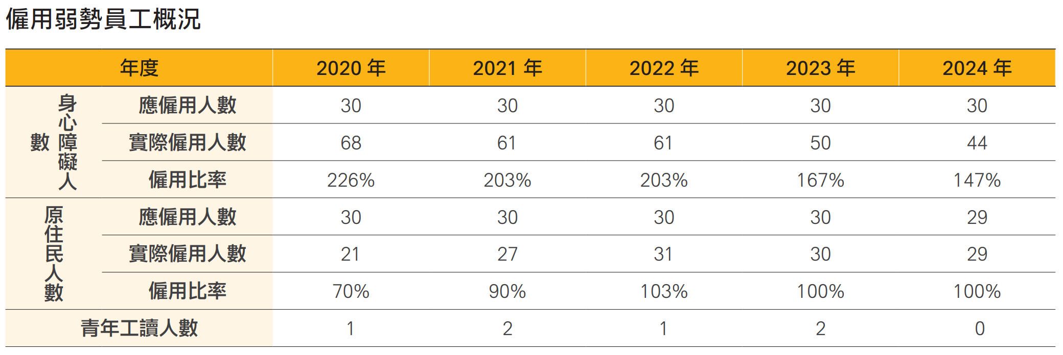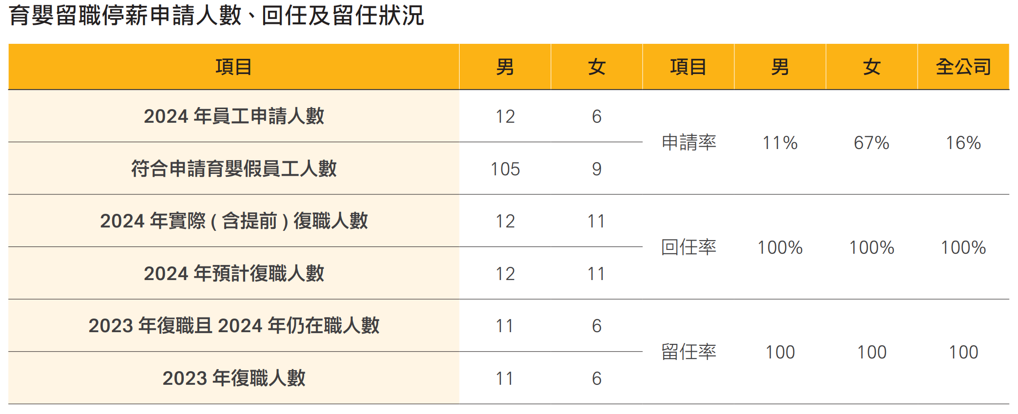 2024年育嬰留職停薪,應復職23人(12男、11女),實際復職23人(12男、11女,含提前復職人數),回任率100%,另2023年育嬰留職停薪復職有17人(11男、6女),留任超過一年,留任率100%。女性亦有生理假、每日60分鐘哺(集)乳時間。