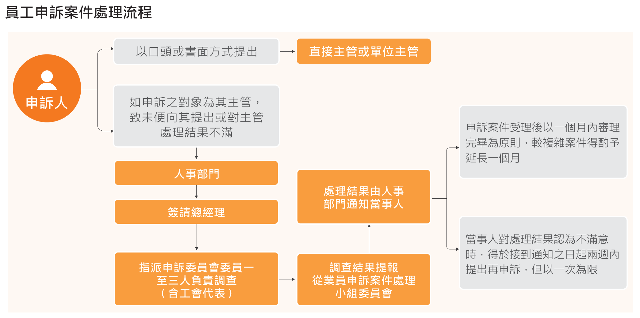在意見反映途徑上,台船公司則有設置「申訴委員會」及訂定《從業員申訴案件處理要點》,提供員工申訴管道,以維護員工權益。若有同仁對公司現行制度、辦法或行政措施未盡事宜、人事法令執行不當或其它影響其工作士氣或合法權益者,得向公司申訴處理委員會提出申訴,如對其申訴處理結果不服時,可再向公司申請再申訴或複議。2024年間未有員工申訴案件。
