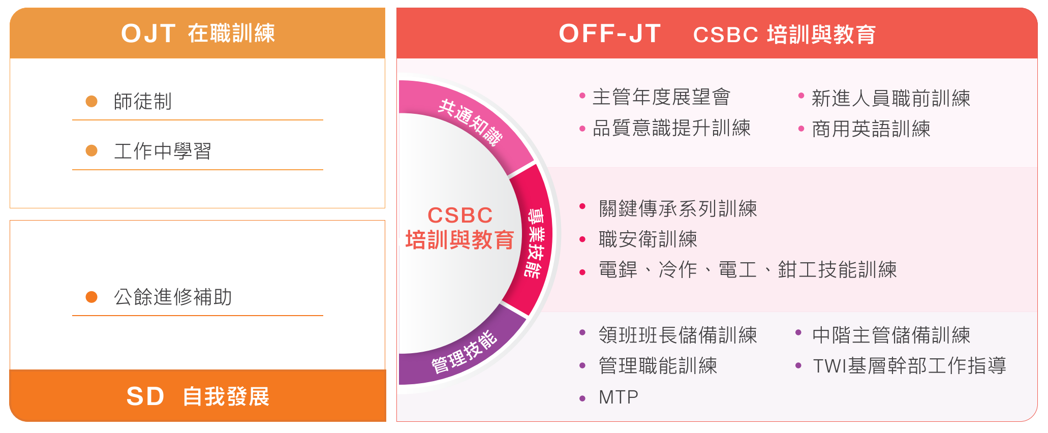 台船公司致力於打造學習型組織,鼓勵員工持續學習、發展潛能,提升個人素質,並透過多元學習機會,建立組織學習與知識分享文化,以促進人才培育,達成企業永續發展。