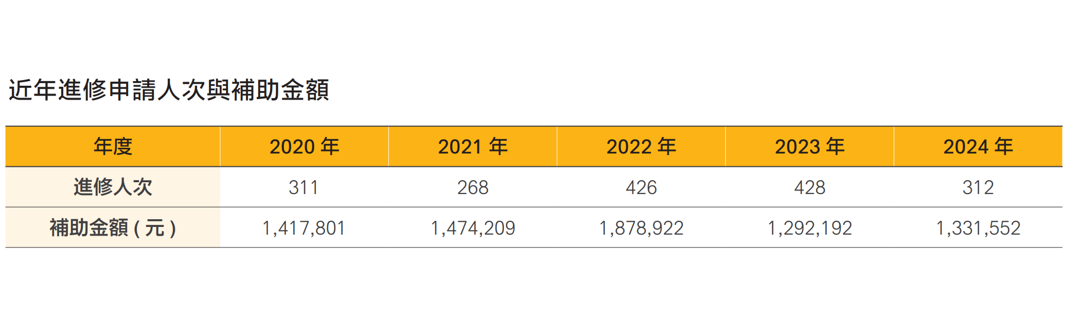為此,台船公司公司訂有《公餘長短期進修補助作業要點》,鼓勵員工自主利用公餘時間進修,以提升專業技能與人力素質。此外,為協助員工精進專業能力、拓展職場視野,也依據《派訓作業基準》,根據業務需求與員工發展目標,安排適合的外部訓練課程,提供多元的學習資源與成長機會。