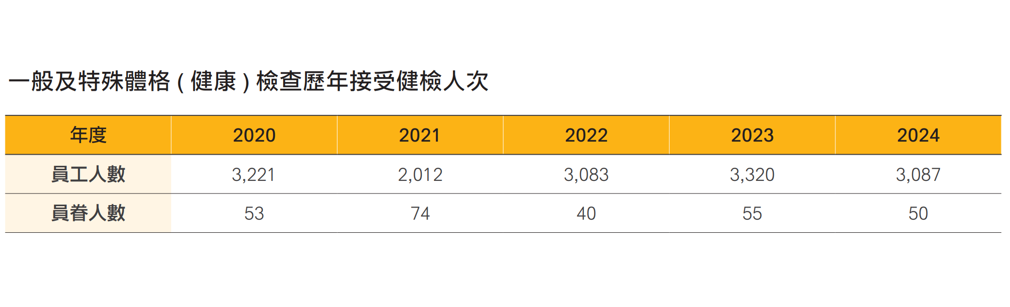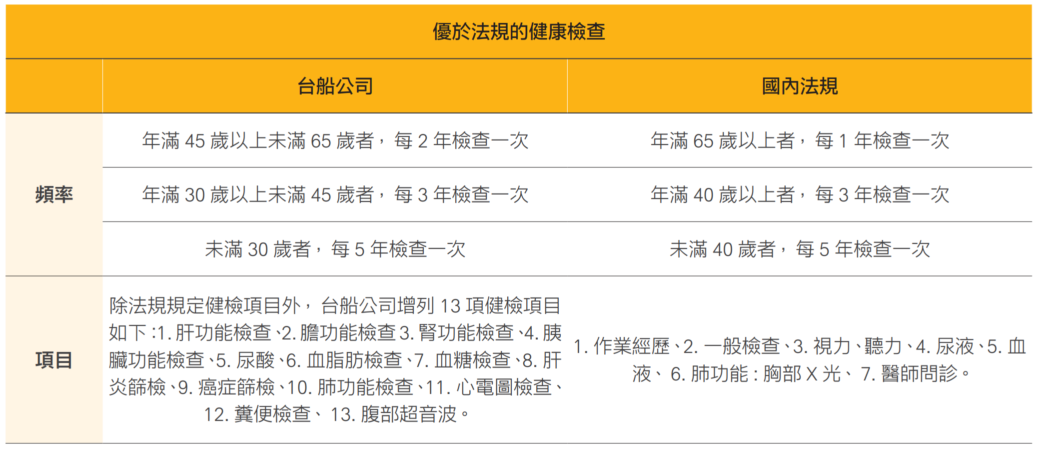 台船公司以優於法規的檢查年限及項目,每年由廠內從事勞工健康服務之護理師辦理年度體檢,定期由職業醫學專科醫師審視,為員工量身打造檢查項目,完整記錄且建立健康資料庫,超過標準值異常由職業衛生護理師發出通知單,視實際需求安排醫師諮詢訪談、健康諮詢及複檢,並提供衛教資訊;若受檢結果嚴重異常,健檢醫院則緊急通知受檢員工及職業衛生護理師,協助員工盡速至醫院復診。另外,對承攬商及員工眷屬健康亦積極守護,定期辦理優惠體檢方案,擴及數百人受惠,獲得好評。