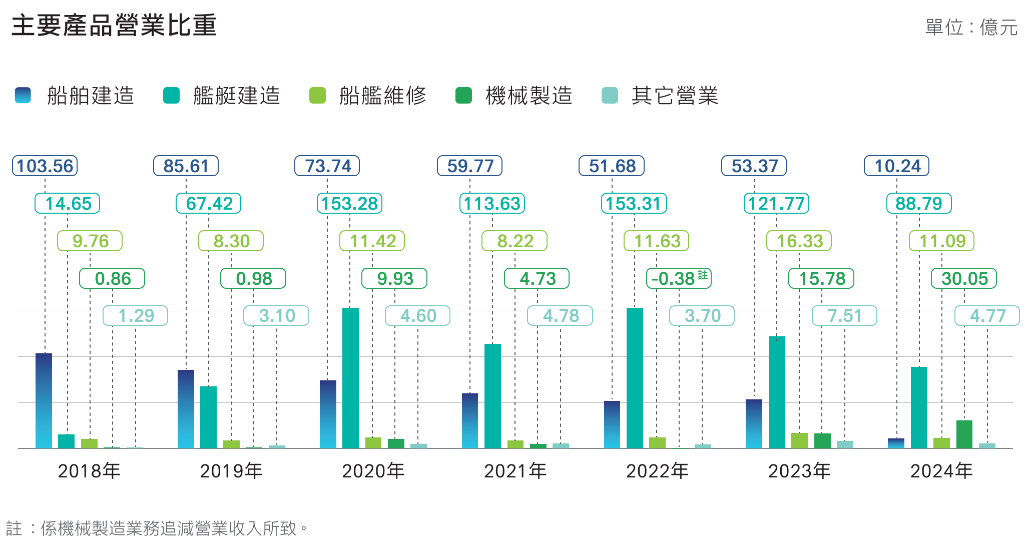 產品營業概況十多年來台船公司定位為貨櫃船專業船廠,並依市場需求搭配散裝貨輪或油輪業務。擁有百萬噸級船塢1座、10萬噸級船塢4座,致力於將優良造船技術推廣至全世界。歷年國內主要客戶群有:長榮、萬海、陽明、德翔;國外主要客戶群:EastMed、Greenland Petroleum Operations Pte Ltd、Seaspan、SITC,其分佈區域包含:亞洲(中國、香港、馬來西亞、印度、以色列、日本、韓國、科威特、新加坡)、美洲(加拿大、智利、美國)、歐洲(丹麥、法國、德國、希臘、荷蘭、挪威、英國)及非洲地區(南非)。 近年配合政府推動國艦國造與離岸風電政策,台船公司已積極轉型為「造船本業」、「國艦國造」、「離岸風電」、「石化基建」等四大區塊多角化經營,已逐漸顯現轉型成效。 船舶方面,於2024年間共計完工交船7艘,其中高雄廠區交付6艘(1艘海巡署4,000噸級巡防艦、1艘海軍新型救難艦、1艘50,000噸級油品化學品輪以及3艘渡輪)、基隆廠完工交付1艘(海巡署1,000噸級巡防艦)。 國艦國造為台船公司四大營運主軸之一,為推動國艦國造並建立造修能量,台船公司極力爭取國艦國造業務,並成立專案管制處,以整合公司資源且專責公務船專案管理與合約管理,全力支持國家國防自主政策目標,追求如期如質完工。 2024年在國艦國造方面,取得國家海洋研究院海洋基礎資料調查船2艘及關務署基隆關100噸巡緝艇2艘等建造業務;未來業務重點將爭取海巡署新一代海巡艦艇等多項重大國家造修艦任務。