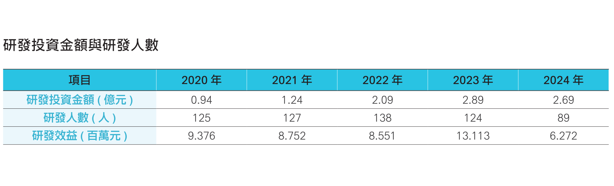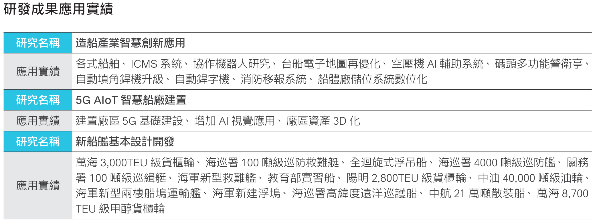 創新管理配合國家重大政策及公司營運發展方向,近年主要研發重點在於提升智慧化船舶及建立國防自主技術研究等,憑藉台船公司深厚的研發技術能量,並結合國內外技術專業團隊,積極開創台船公司自有品牌商品,冀能強化公司競爭力及增加營收與獲利。 台船公司2024年研究發展費用約2.69億元,配合國艦國造政策持續執行相關研發案,透過產官學等資源合作,同時兼顧友好關係,以更有效率達成其研究發展目標;此外,亦於年度召開「研發專題期末成果報告」,邀集廠內員工一同參與,以達內部知識分享效益,以及促進各單位間的意見交流。