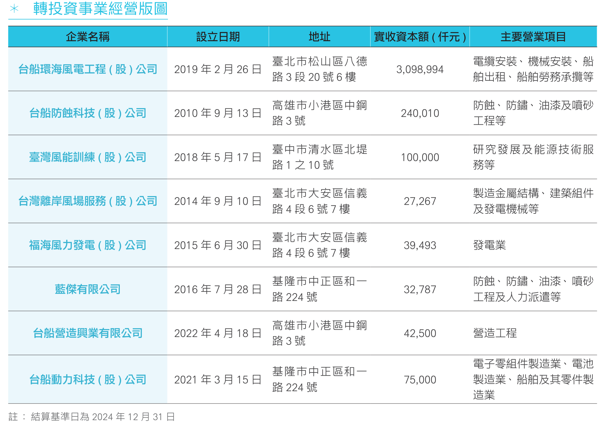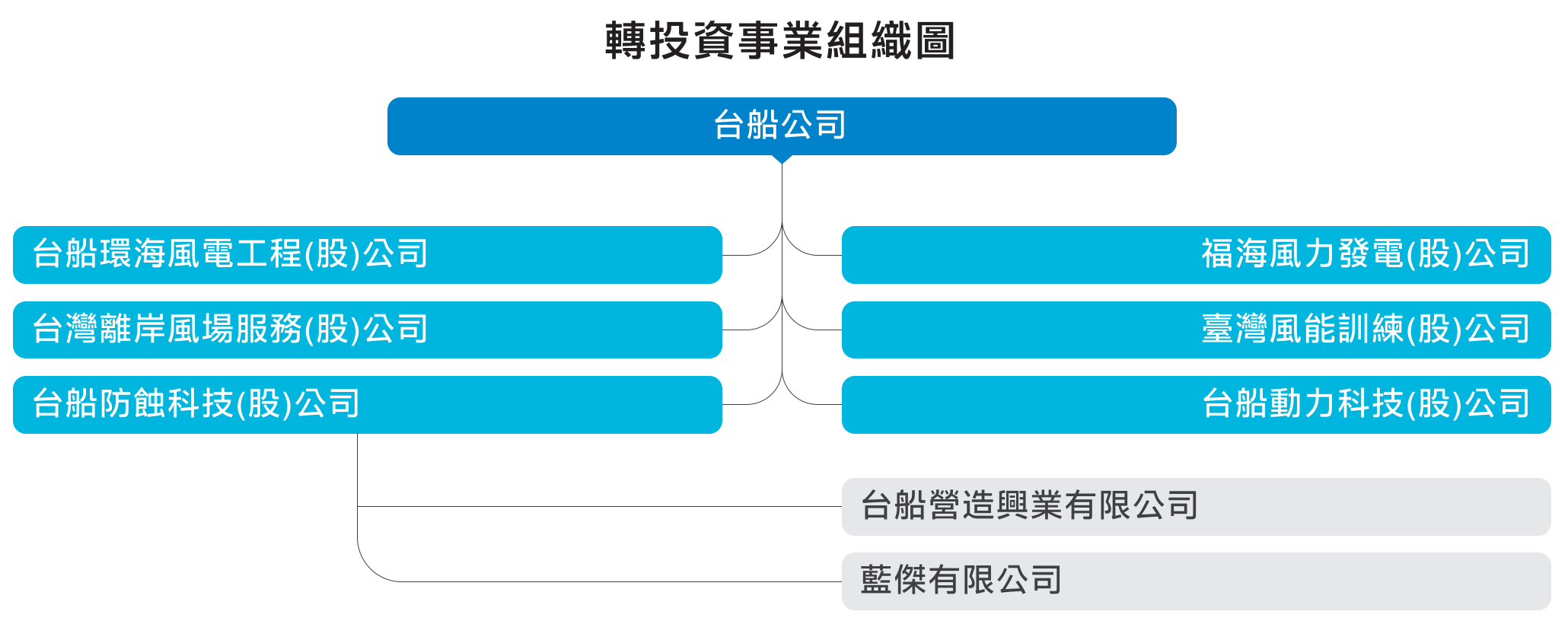 轉投資事業自2010年台船公司建立起多角化經營事業,以有效推動轉投資計畫,達成轉投資計畫目標及效益。截至2024年底,台船集團共有8家轉投資事業。